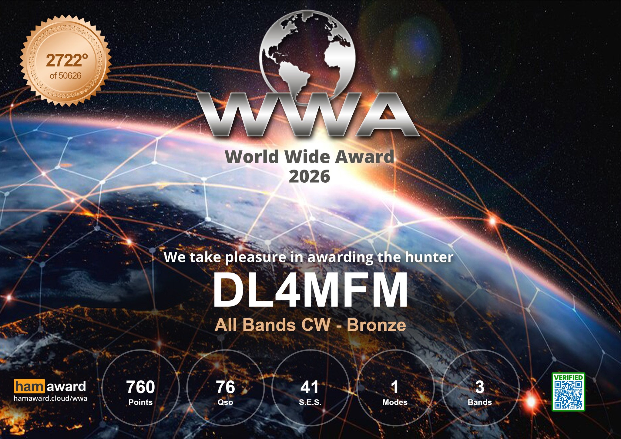 Der WWA – World Wide Award 2026 hat mir viel Spaß gemacht. Auch wenn ich zeitlich gar nicht so viel Funkbetrieb machen konnte, habe ich doch immer wieder ein paar Sonderstationen gearbeitet.