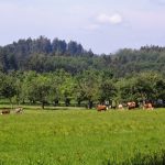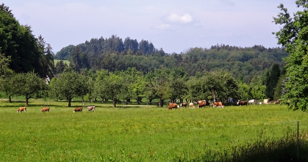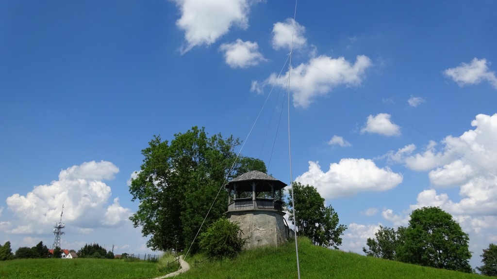 Geparkt werden kann etwa hier N 47.53849, E 9.79975. Das sieht auf der Karte aus, als ob man schon fast am Ziel angekommen wäre, aber es geht dann doch noch ganz schön steil die nur für Anwohner freigegebene Straße in Richtung Gipfel hoch. Der Gipfel selbst liegt auf einer Wiese mit Gipfelkreuz, Gipfelbuch und einer Bank. Platz, um eine Dipolantenne aufzubauen, ist ausreichend vorhanden. Jedoch war der Gipfel komplett mit Elektrozäunen eingefriedet. Also Rucksack abnehmen und drunterherkrabbeln.