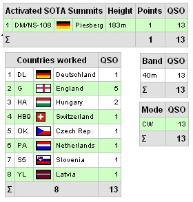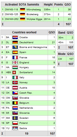 Bad weather was coming up, therefore I decided to activate DM/NS-108 as DR44WFF/p again. But this weekend on shortwave. In spite of the WAEDC I had no problems to find free frequencies. Thanks to Ingo, SM6CMU, for the DX-Cluster spot. This helped on 30m.