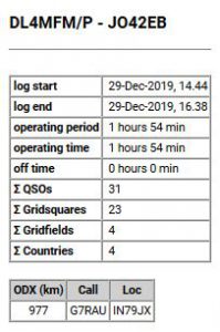 Nach dem Einschalten der Station war gleich G4LDR mit S9+++ zu hören. Das Pile Up zu GU6EFB konnte ich schon beim zweiten Anruf brechen. Ein neues DXCC auf 144 MHz – super. Nachdem der Weihnachts-UKW-Contest in UK beendet war, habe ich einen Spot auf GMA und SOTA abgesetzt und es meldete sich alsbald Phil, G4OBK. Das war eine riesen Überraschung.