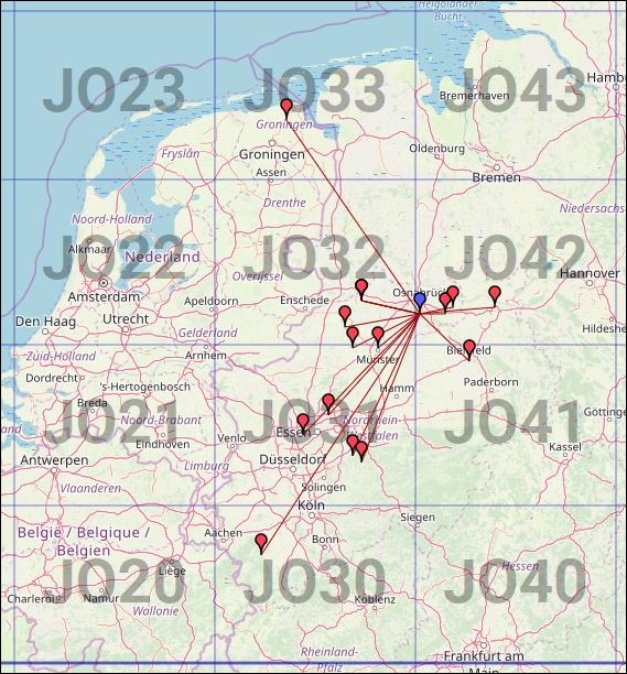 78 QSOs sind ins Log gekommen. Richtung Skandinavien hätte es besser gehen können. Die üblichen Stationen wie SK6MW, OV3T, … kamen heute mit deutlich schwächerem Signal als üblich auf dem Dörenberg an. So fehlten mir zu einem Endergebnis, das zu den QSO-Zahlen passte, noch ein paar Großfelder für die Sonderpunkte. Ansonsten hat es wirklich Spaß gemacht und das Stationsangebot aus dem Distrikt Westfalen-Nord war toll. Viele Stationen haben mitgemacht, sodass das Ergebnis für den WNA (Westfalen-Nord Aktivitätsabend) mit weit über 4000 Punkten gut war.