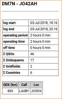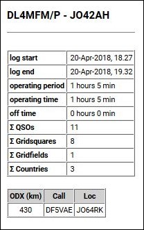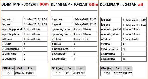 Ausgezeichnete Ausbreitungsbedingungen haben viele „exotische“ Stationen in Logbuch gebracht. Die von mir gearbeiteten LA-Stationen (Norwegen) hätte man sicher auch mit einem Handfunkgerät erwischt. Dazu konntze ich noch Jörg, DO1DJJ/P auf dem 469m hoehen Hofberg (DA/RP-346) und Pom, DP9X, auf dem 496m hohen Köterberg loggen.