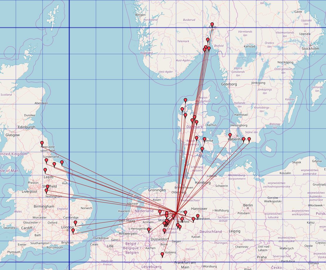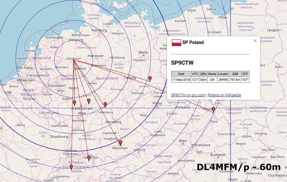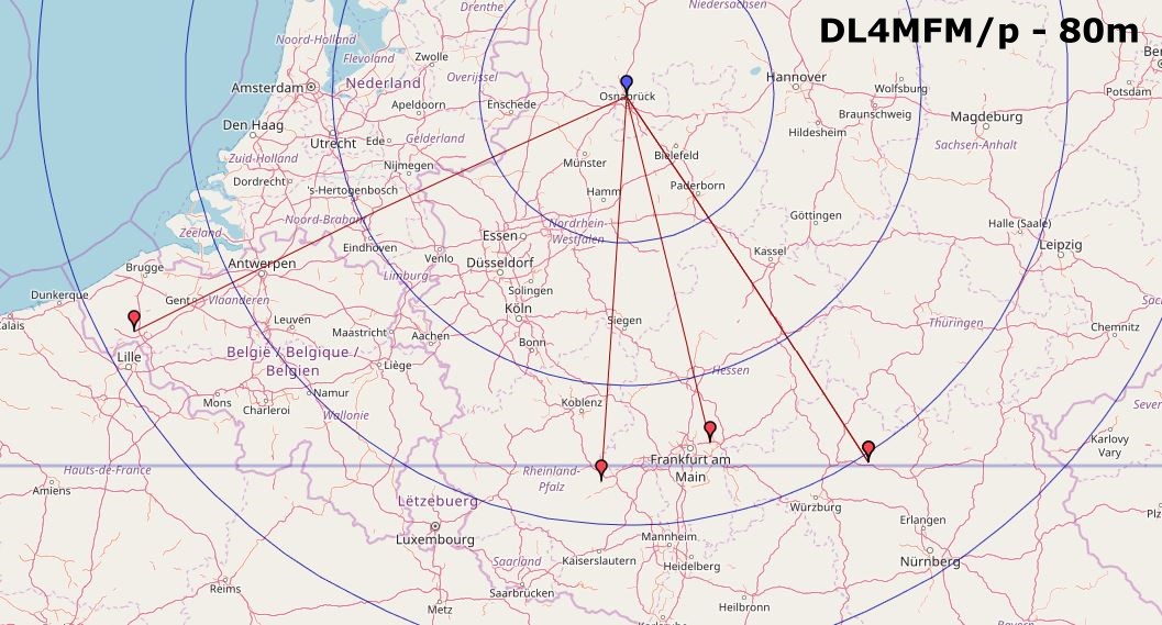 Neben DB0LTG (Entfernung 129km JO42AE<>JO31TB) konnte ich auch noch gut DB0XY (Entfernung 164km JO42AE<>JO51EU) empfangen. Ein Sked mit SK7MW ist leider gescheitert. Zwar konnte ich die Telegrafie-Signale von SK7MW ausreichend hören, aber meine Station war nicht stark genug, das Radar-QRM bei SK7MW zu durchbrechen.