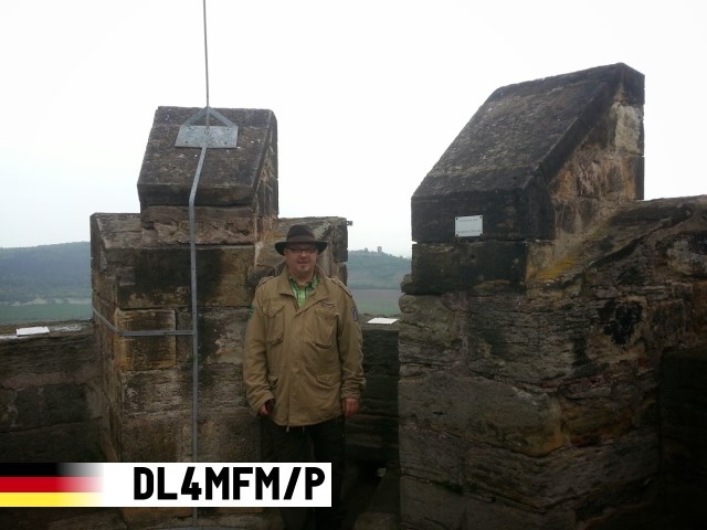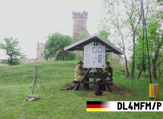 ![]() ![]() | Am 1. Mai wird unter verschiedenen Titeln und von verschiedenen Veranstaltern ein Burgentag abgehalten. Für uns Bergfunker ist das ein guter Anlass, einen Berg mit Burg aufzusuchen. Von Lutz, DJ3AX, wurde dazu die Mühlburg ausgesucht, einer Burg der „Drei Gleichen„. Das sind drei Burgen in der Nähe von Gotha, die recht nah beieinander stehen. Unsere Wandergruppe bestand aus Angela (DL1RMI), Bettina (DC1BF), Lutz (DJ3AX), Peter (DK2RMP) und Mario (DL4MFM). Die Regeln (WCA – World Castle Award) sagen zwar, man könne im Umkreis von 1000m um eine Burg seine Station aufbauen (das erklärt die vielen Fotos von Aktivitäten zu diesem Event im Internet, wo gar keine Burg zu sehen ist), aber das ist natürlich keine Option für uns. Das Wetter war wie angekündigt: Schauer, Gewitter, Platzregen. Nachdem die Blitze rund um uns herumzuckten, waren wir schon kurz davor, den Funkbetrieb abzubrechen. Die meiste Aktivität findet wohl auf den UKW-Relaisfunkstellen, mit der üblichen Betriebstechnik, statt. Eine Station gab an, mit dem Handfunkgerät im Wohnzimmer zu sitzen und dort eine Burgenaktivität durchzuführen; denn in der Nähe sei eine Burg. Unser Team hat aber entweder Kurzwelle gemacht oder auf UKW-Direktfrequenzen gefunkt. Sogar Fernschreibverbindungen (BPSK) wurden auf 20m durchgeführt. Nach etwa einer Stunde Funkbetrieb mit drei Stationen sind schätzungsweise 50 QSOs ins Log gekommen, danach ging es zum Kaffeetrinken in die Burg. Das Wetter wurde zu ungemütlich. Station: