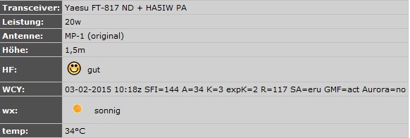Die Ausbreitungsbedingungen waren auf 20m und 17m ausgezeichnet. Leider fehlten nur oft die Gegenstationen, EU und NA war immer offen mit S9+++ Signalen. Als sehr wichtig hat sich mal wieder ein DX-Cluster-Spot erwiesen. Über das Band dreht wohl kaum noch jemand … Bergfunk geht in Telegrafie ausgezeichnet, die Flora & Fauna-„Hunter“ bevorzugen SSB. COTA ist wie immer nur ein K(r)ampf 🙂