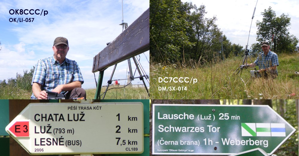Of course it is the same mountain, but the border between the Czech Republic (OK) and Germany (DL) is directly on the summit. Couriously DM/SX-014 gives 8 SOTA points and OK/LI-057 6 SOTA points.I started the ascent from Waltersdorf. It was steep, but after 30 minutes I was on the summit. I decided to activate first with OK8CCC/p. When the setup was done and the antenna tuned to 40m I heard a very big signal from another OK-station. It was OK/DL7VKD/p calling CQ SOTA. I answered and he gave me 599 plus OK/LI-057. Hihi, Dieter was on the same summit but a little bit in the forest, I was directly on the summit.