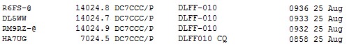Auf 7024 ging es dann los mit „CQ FF“ aus DLFF-010. Langsam aber stetig kamen Stationen ins Log. Nachdem sich niemand mehr meldete machte ich QSY auf 10 MHz. Hier meldete sich jedoch nur eine Station aus Finnland, obwohl ich im Reverse Beacon Net europaweit ein gutes Signal hatte. Also gleich weiter auf 20m. Hier kam es durch mehrere DX-Cluster-Meldungen zu einem Riesen-Pile-Up wie ich es selbst noch nie erlebt hatte. Der Empfänger des kleinen YAESU war, totz 300Hz Filter, völlig überlastet und ich konnte kaum ein Rufzeichen lesen.