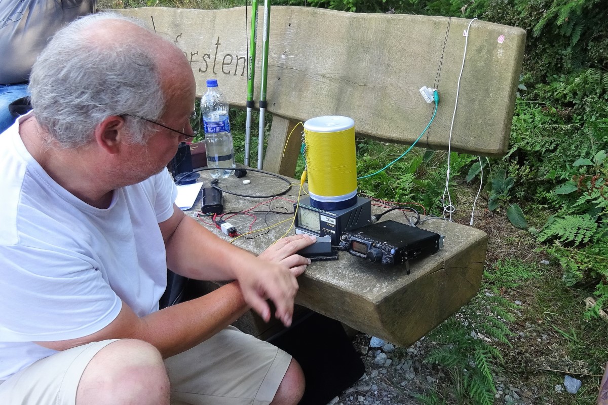 Ein besonderes Highlight hatten noch Wolfgang, DK1HW, und Chris, DL1CR, zu bieten. Chris hatte sich auf dem Fast, DM/NS-121, in Position gebracht und beide hatten eine 630m (472 kHz) Station aufgebaut und ein S2S (Berg zu Berg) QSO durchgeführt. Dazu hatte Wolfgang an unserem Stantdort eine 46m lange Antenne, mit Anpassspule, selbstgebautem Transverter und einen YAESU FT-817 aufgebaut. Nachdem seine Anlage in Betrieb war konnten wir Chris schon „CQ“ rufen hören. Das QSO klappte auf Anhieb.