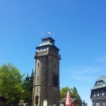 Nach diesem schmalen Mahl ging es also weiter zum Bärenstein. Auf dem Gipfel hatte ich nun tatsächlich erstmal Probleme, einen geeigneten Standort für den Antennenmast zu finden. Vom Parkplatz aus führt ein Weg Richtung Norden, vorbei am Sendeturm, auf eine Art Kanzel mit Geländer. An diesem Geländer ließ sich der Mast mit Dipol aufbauen. Nicht optimal, aber es reichte dann doch für 29 QSO, davon eines auf 2m mit Jörg, DG0JMB, in Chemnitz.