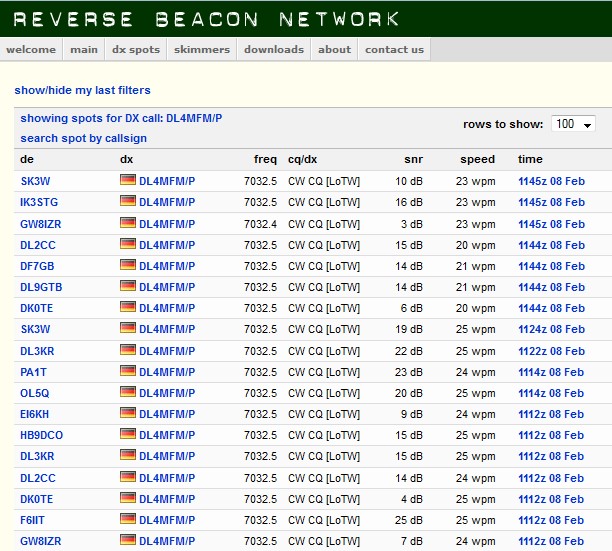 Hier die Spots aus dem Reverse Beacon Network. Die Signalstärken waren am heutigen Tage unterdurchschnittlich. Kaum eine Station erreichte S9. 7032 kHz +/- hatte wieder irgendeine kommerzielle Mehrton-Station in Beschlag genommen.
