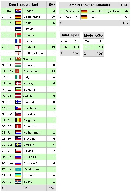 gemacht und zwar auf 7 MHz CW und auf 14 MHz in SSB. Die Anstrengung hat sich also gelohnt. Nur Berg drei ist ausgefallen …